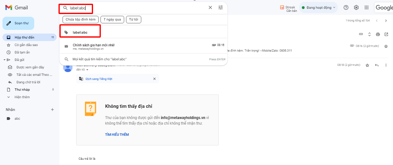 Bước 2: Nhập label:tên_nhãn (thay thế tên_nhãn bằng tên nhãn bạn muốn lọc) và nhấn Enter