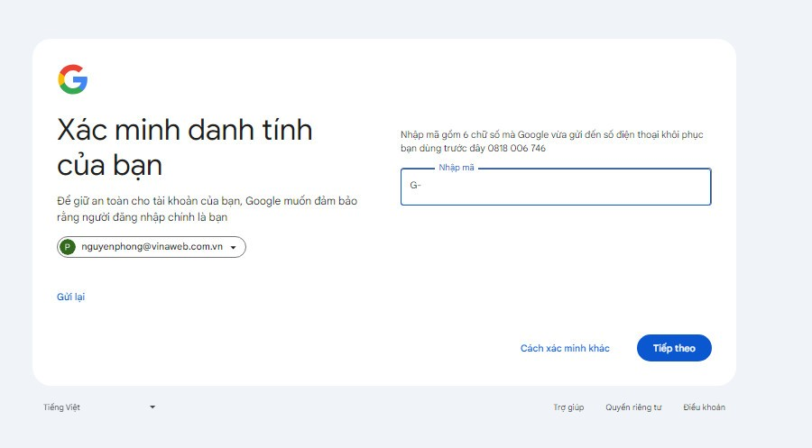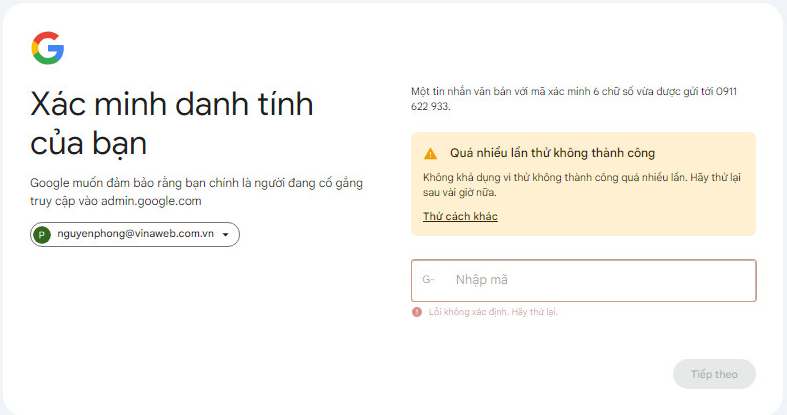 Bước 1: Đăng nhập bằng tài khoản admin tại: admin.google.com. Sau đó hãy nhập số điện thoại mới và nhận mã xác thực đăng nhập.