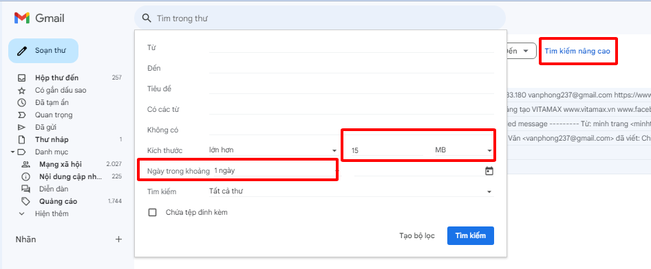 - Email lớn hơn một kích thước nhất định, chẳng hạn như 15 MB ( thử trong Gmail )