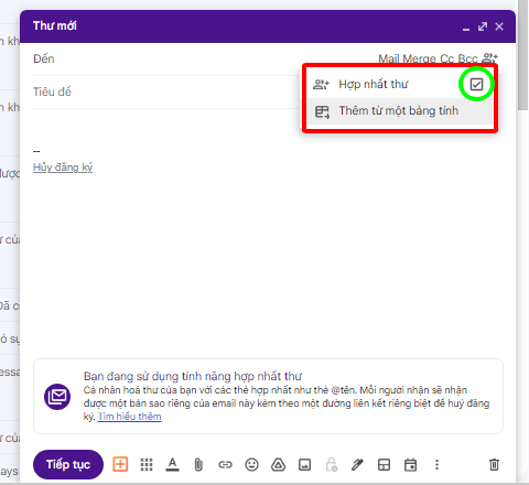 Bước 3: Tích vào tính năng Hợp nhất thư và chọn Thêm từ một bảng tính