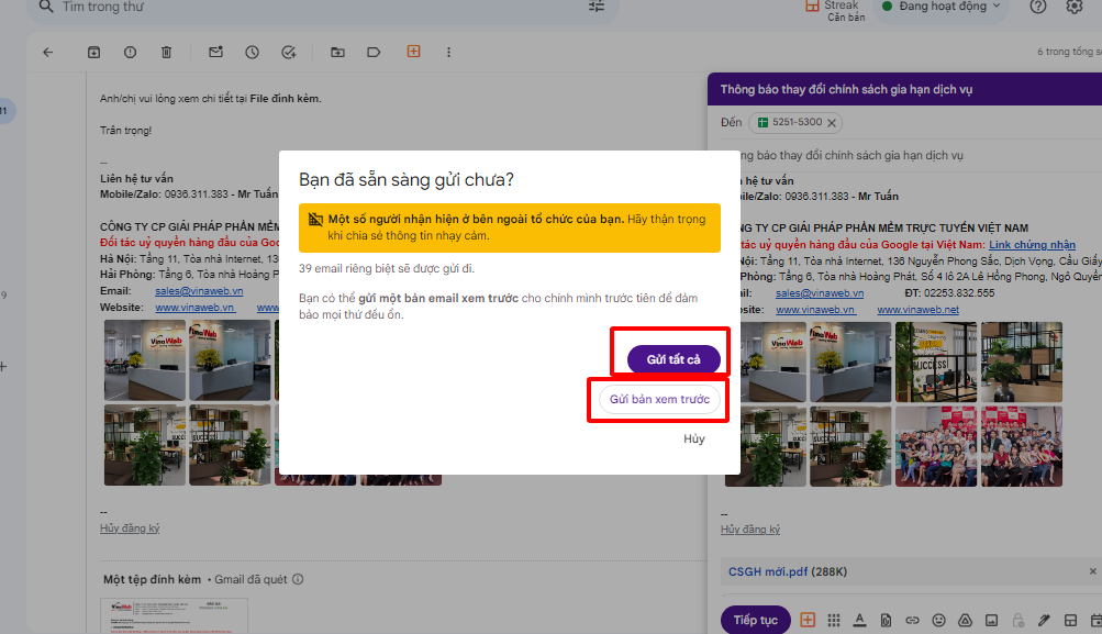 Bước 8: Cuối cùng, bạn chọn Gửi tất cả để gửi email tới danh sách data của mình hoặc chọn Gửi bản xem trước để xem trước email của mình sẽ như thế nào khi được gửi tới khách hàng