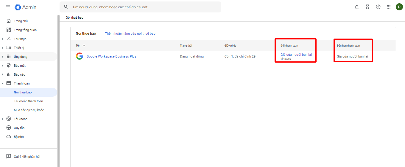 - Bước 3: Gói Google Workspace hiện tại của bạn sẽ được hiển thị, bao gồm loại gói (theo tháng, theo năm hay linh hoạt) và các tính năng đi kèm.