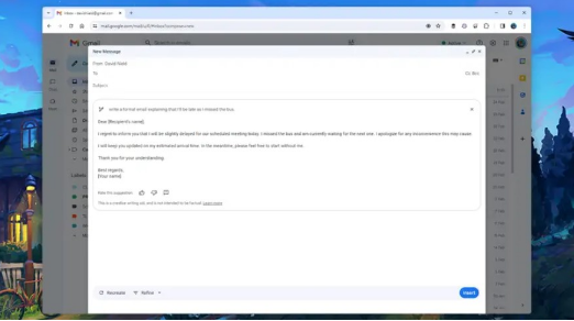 Nhấp vào Insert để thêm văn bản vào email của bạn hoặc Recreate để tạo văn bản mới từ cùng một lời nhắc. Thông qua menu Refine, bạn có thể điều chỉnh văn bản mà Gemini đã tạo: Bạn có thể Chính thức hóa, Xây dựng hoặc Rút ngắn nó và các tùy chọn đó cũng bật lên nếu bạn đánh dấu văn bản đã có trong email.