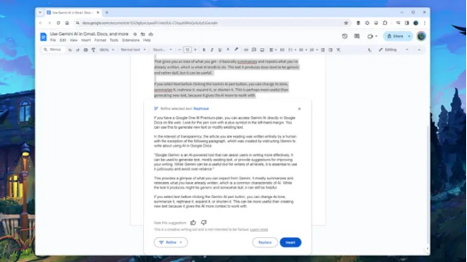 Nếu bạn chọn văn bản trước khi nhấp vào nút bút Gemini AI, bạn có thể thay đổi giọng điệu, tóm tắt, diễn đạt lại, mở rộng hoặc rút ngắn văn bản. Điều này có lẽ hữu ích hơn việc tạo văn bản mới vì nó mang lại cho AI nhiều công việc hơn.