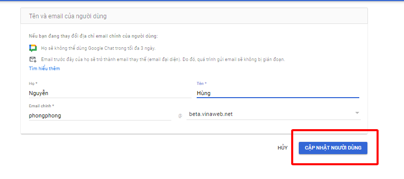 Bước 8: Đổi tên và nhấn "Cập nhật người dùng" để hoàn tất