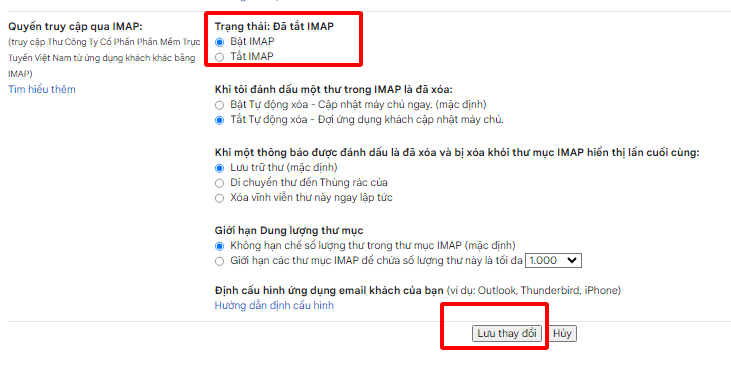 Bước 3: Trong phần Truy cập IMAP, chọn Bật IMAP và Lưu thay đổi.