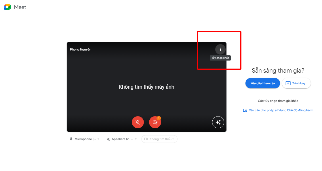 meet.google.comvà chọn cuộc họp bạn muốn tham gia. - Bước 2: Nhấp vào biểu tượng Cài đặt (biểu tượng ba chấm) ở góc trên bên phải màn hình.