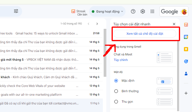 - Nhấp vào biểu tượng "Cài đặt" (hình bánh răng) ở góc trên bên phải của trang Gmail.