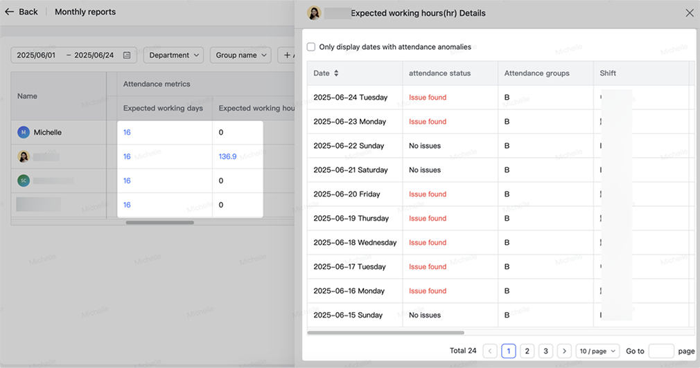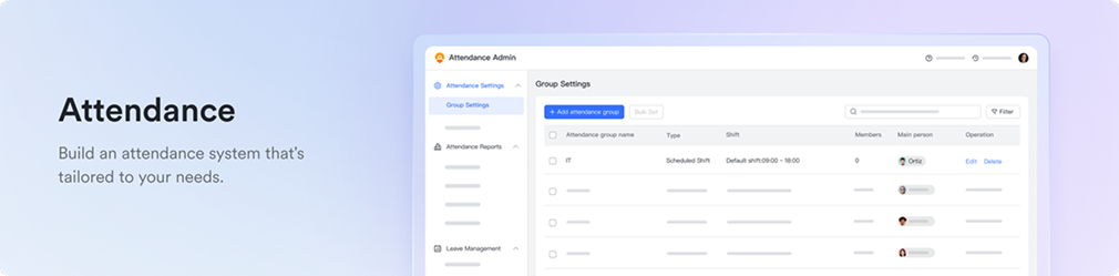 Không chỉ dừng ở việc ghi nhận giờ làm, Lark Attendance cung cấp bộ công cụ quản trị giúp HR và quản lý kiểm soát dữ liệu chấm công một cách hệ thống.