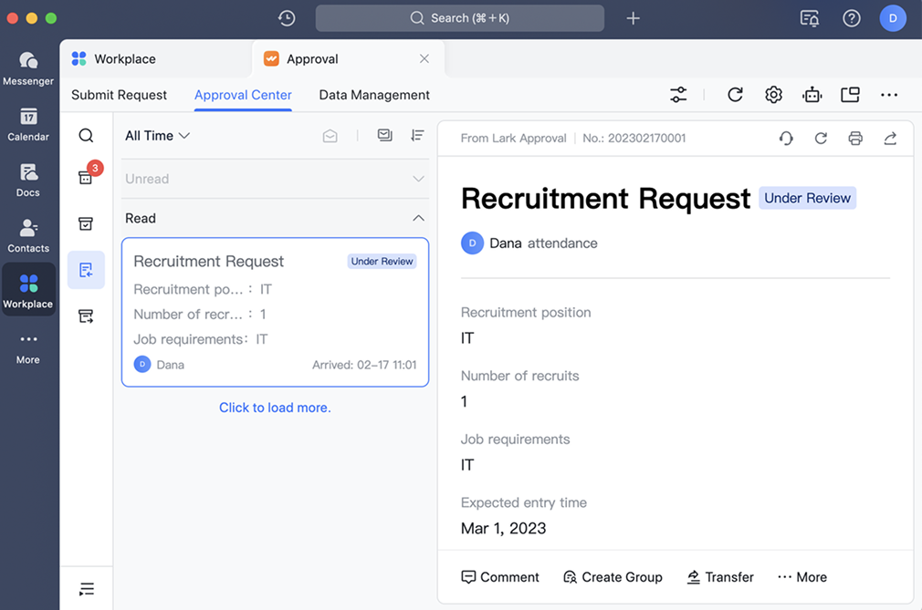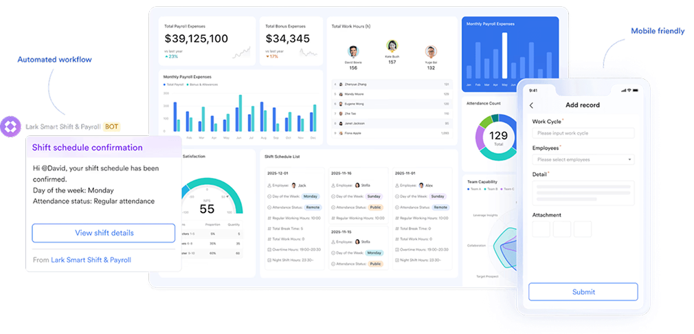 Khi nhân viên gửi đơn nghỉ phép, đi công tác hoặc làm việc ngoài văn phòng trên Lark Approval, sau khi được cấp quản lý phê duyệt, hệ thống sẽ tự động cập nhật trạng thái chấm công tương ứng. Bộ phận nhân sự không cần đối soát thủ công giữa đơn từ và bảng công như trước.