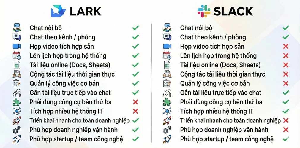 Khi đặt Lark và Slack cạnh nhau, nhiều người chỉ cần biết công cụ nào làm được việc mình cần, chứ không muốn đọc quá nhiều tính năng. Bảng dưới đây tóm gọn các điểm khác nhau quan trọng nhất, nhìn nhanh là hiểu ngay.