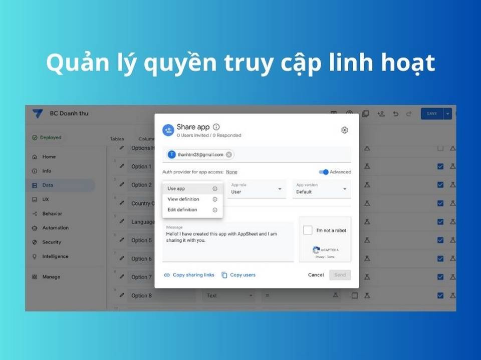 - Phân quyền: AppSheet cho phép phân quyền chi tiết cho từng người dùng hoặc nhóm người dùng, bao gồm:
