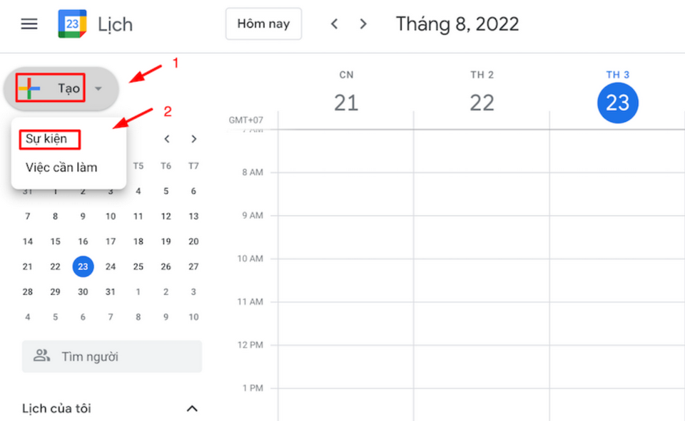 - Bước 1: Bạn hãy truy cập vào giao diện chính của ứng dụng Google Calendar, nhấp chuột vào ngày + khung giờ của sự kiện. Sau đó, hãy tiếp tục nhấp chuột vào chữ “+Tạo” phía trên góc trái màn hình.