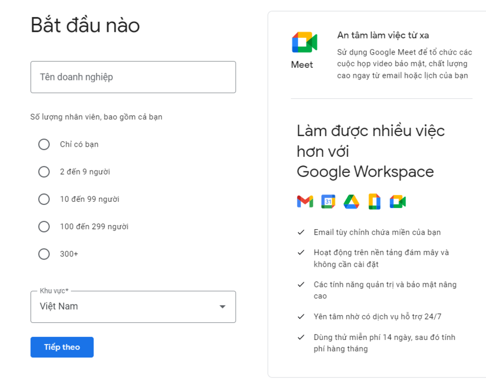 Bước 1: Đầu tiên, bạn truy cập vào trang web chính thức của Google Workspace và chọn “Bắt đầu dùng thử miễn phí”. Google cho phép bạn dùng thử miễn phí trong 14 ngày trước khi quyết định đăng ký chính thức.