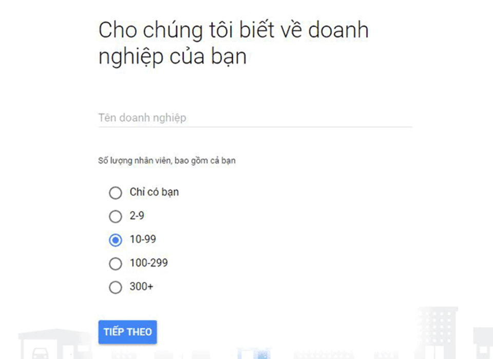 Bước 3: Bạn nhập các thông tin cơ bản về doanh nghiệp như tên công ty, số lượng nhân viên, quốc gia và ngôn ngữ. Sau đó, nhấp vào “Tiếp theo”.