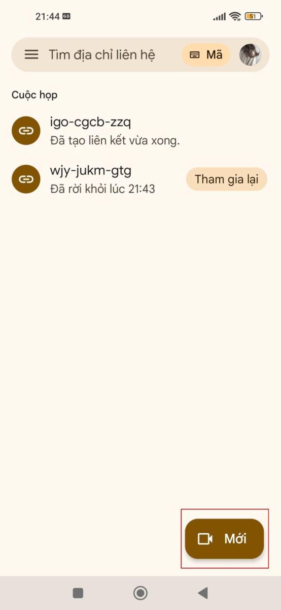 - Bước 2: Mở ứng dụng và đăng nhập vào tài khoản Google. Nhấn vào “Mới” để bắt đầu phòng họp.