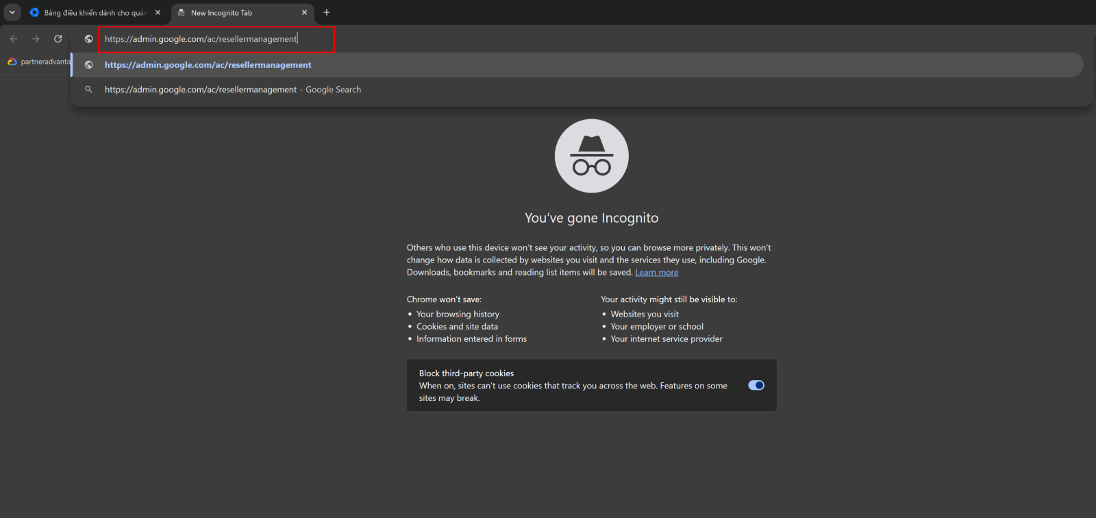 2. Truy cập vào liên kết https://admin.google.com/ac/resellermanagement để thêm mã đại lý, ủy quyền cho Vinaweb gia hạn dịch vụ.