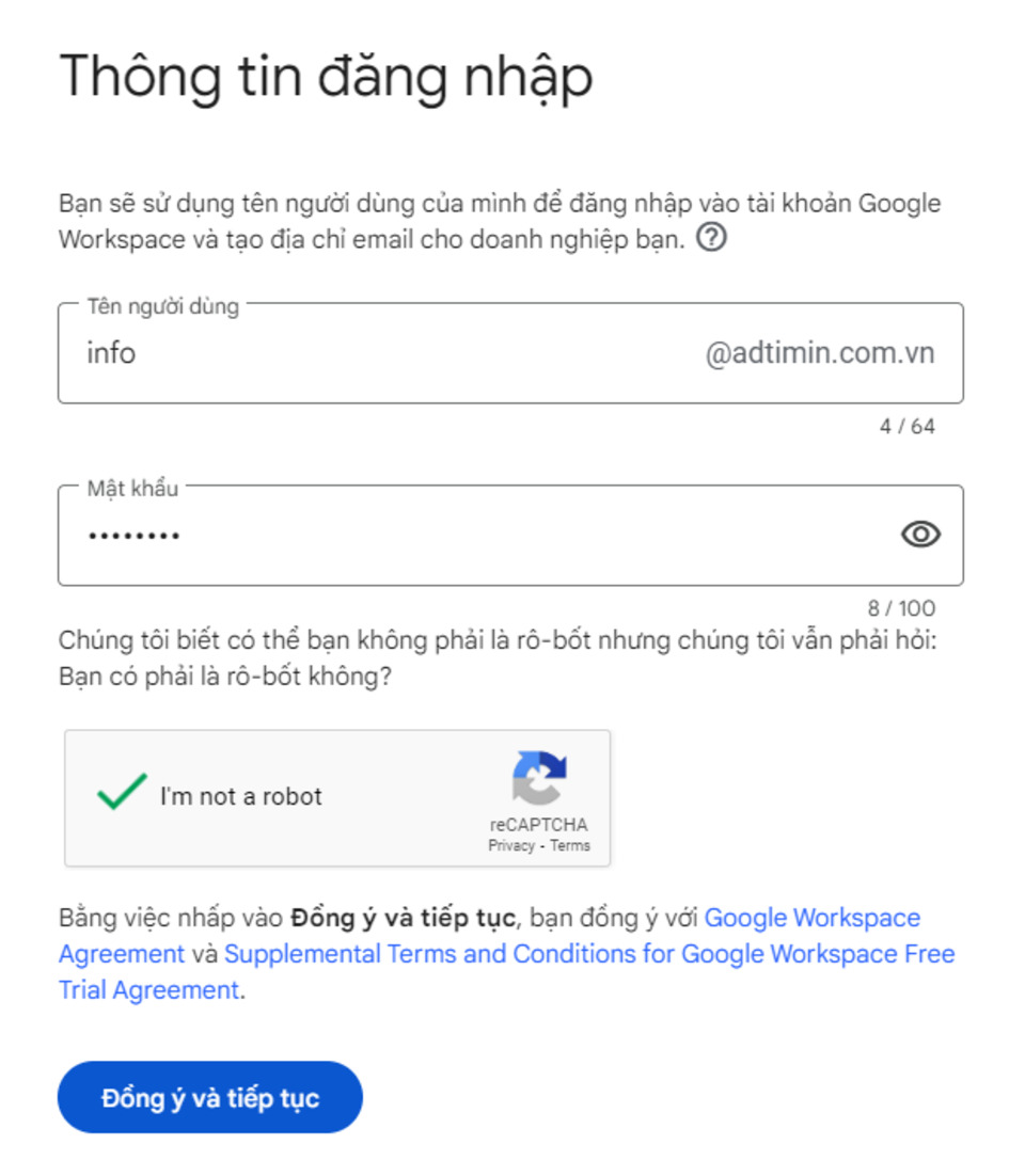 - Tên người dùng và mật khẩu: Tạo tài khoản quản trị đầu tiên với tên người dùng (địa chỉ email) và mật khẩu mạnh. Tài khoản này sẽ được sử dụng để quản lý toàn bộ hệ thống Google Workspace của doanh nghiệp.