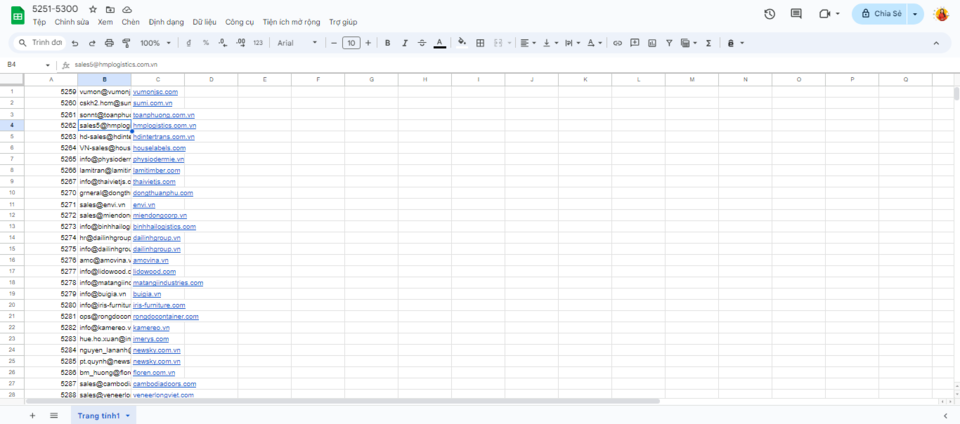 Khi tạo danh sách này, bạn cần bỏ qua cột tiêu đề, bắt đầu nhập dữ liệu từ vị trí hàng số 1. Ngoài ra, có một mẹo nhỏ để dễ dàng tạo tên khách hàng dựa trên phần đuôi email doanh nghiệp của họ. Bạn có thể sử dụng hàm: =RIGHT(B1;LEN(B1)-FIND("@";B1)). Hàm này sẽ tự động lấy phần tên miền trong email để tạo tên khách hàng, tiết kiệm thời gian trong quá trình tạo dữ liệu.