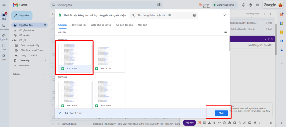Sau khi kích hoạt tính năng hợp nhất thư, bạn sẽ cần chọn bảng tính chứa dữ liệu khách hàng mà bạn vừa tạo. Sau khi chọn bảng tính, nhấn “Chèn” để tích hợp danh sách này vào email.