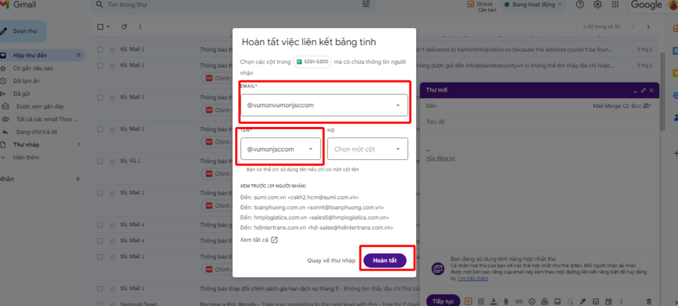 Google Workspace sẽ hiển thị một bảng thông tin để bạn xác nhận. Tại đây, bạn cần điền đúng các thông tin tương ứng với cột dữ liệu đã sắp xếp trong bảng tính. Sau khi xác nhận, nhấn “Hoàn tất” để chuyển sang bước tiếp theo.