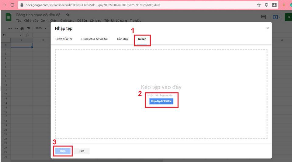 - Trên giao diện sẽ hiển thị bảng, hãy chọn vào mục Tải lên và nhấn Chọn tệp từ thiết bị. Khi đã hoàn thành thao tác tải tệp dữ liệu có sẵn lên, chúng ta cần nhấn mục Chọn để tải tệp mà mình đã lưu từ trong máy lên Trang tính.