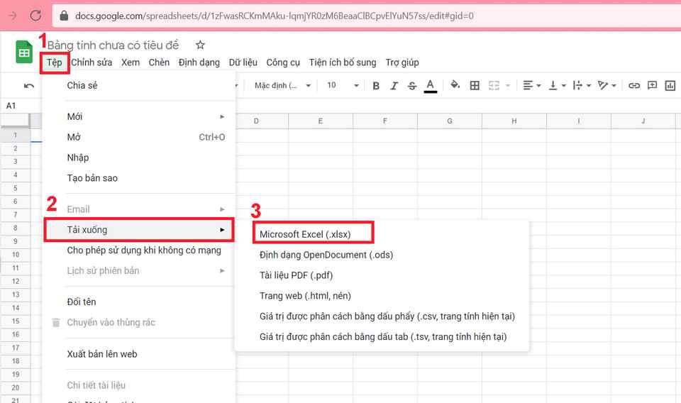 - Nếu có nhu cầu tải tệp về máy tính, bạn hãy vào mục Tệp để nhấn mục Tải xuống, cuối cùng là xác định loại định dạng cho tệp mà bạn muốn tải.