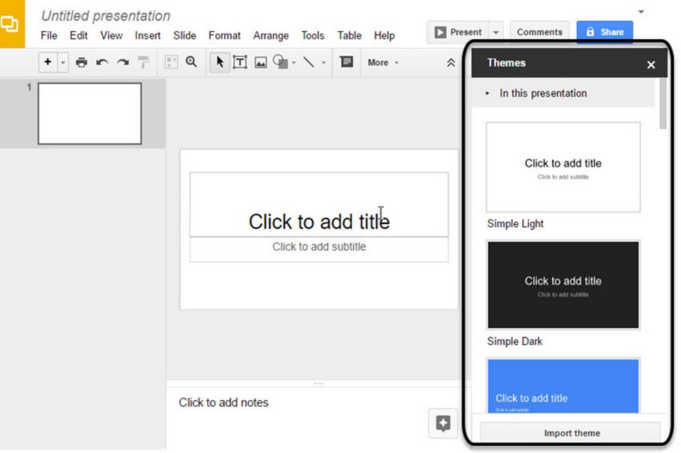 Hãy quan sát trang trình bày của công cụ Google Slide, bạn cần chọn mục Chủ đề. Người dùng có thể dùng thanh cuộn để xác định các chủ đề khác nhau.