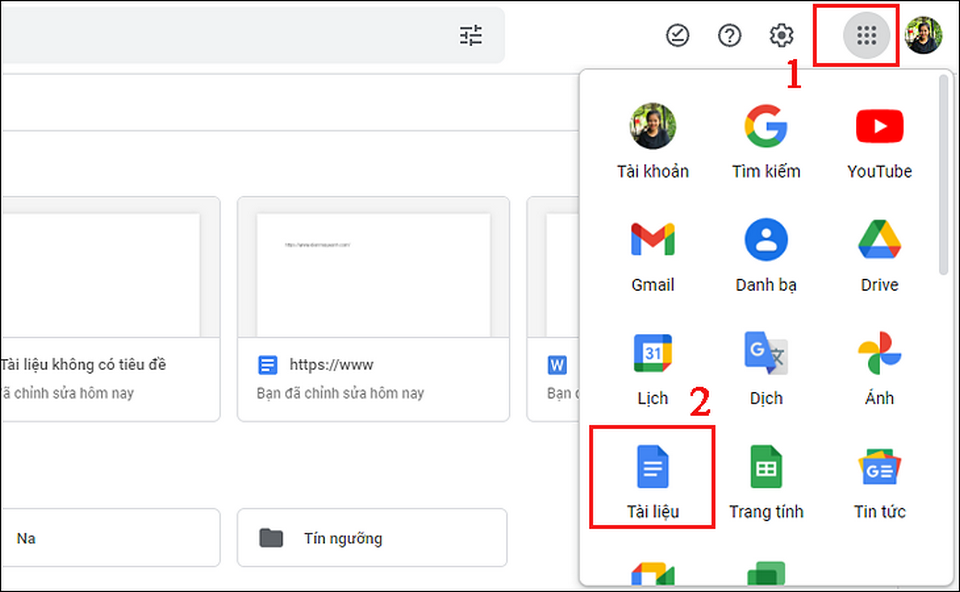 - Chúng ta cần nhấn vào biểu tượng chấm nằm cạnh avatar ở vị trí góc trên bên phải màn hình. Hãy nhấn chọn Tài liệu (Google Docs).