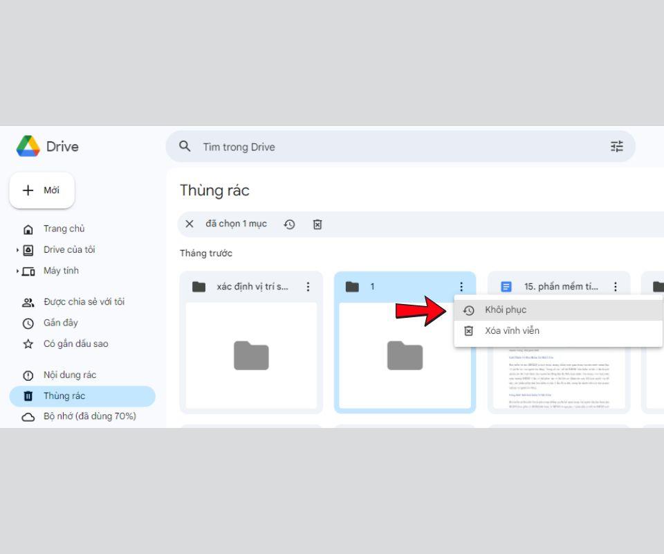 - Bước 2: Nhấp chuột phải vào tệp cần khôi phục và chọn "Khôi phục". Tệp sẽ được khôi phục về vị trí ban đầu. Nếu vị trí này không còn tồn tại, bạn có thể tìm tệp trong mục “Drive của tôi”.