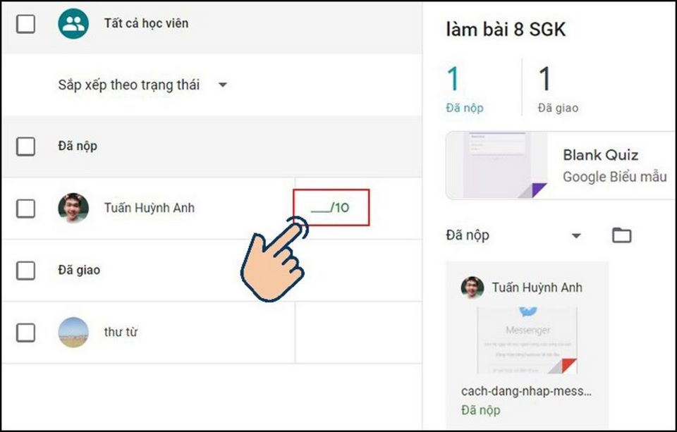 - Xem bài nộp: Nhấn vào mục "Đã nộp" để xem danh sách học sinh đã nộp bài và bài nộp của từng học sinh. Tại đây, bạn có thể chấm điểm và cung cấp phản hồi trực tiếp. Tất cả các hoạt động đều được tự động lưu và đồng bộ trên Google Classroom.