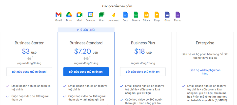 - Business Starter: Phù hợp với các doanh nghiệp nhỏ, cung cấp 30GB dung lượng lưu trữ cho mỗi người dùng. Với đầy đủ các công cụ cơ bản như Gmail, Google Drive, và Google Meet.