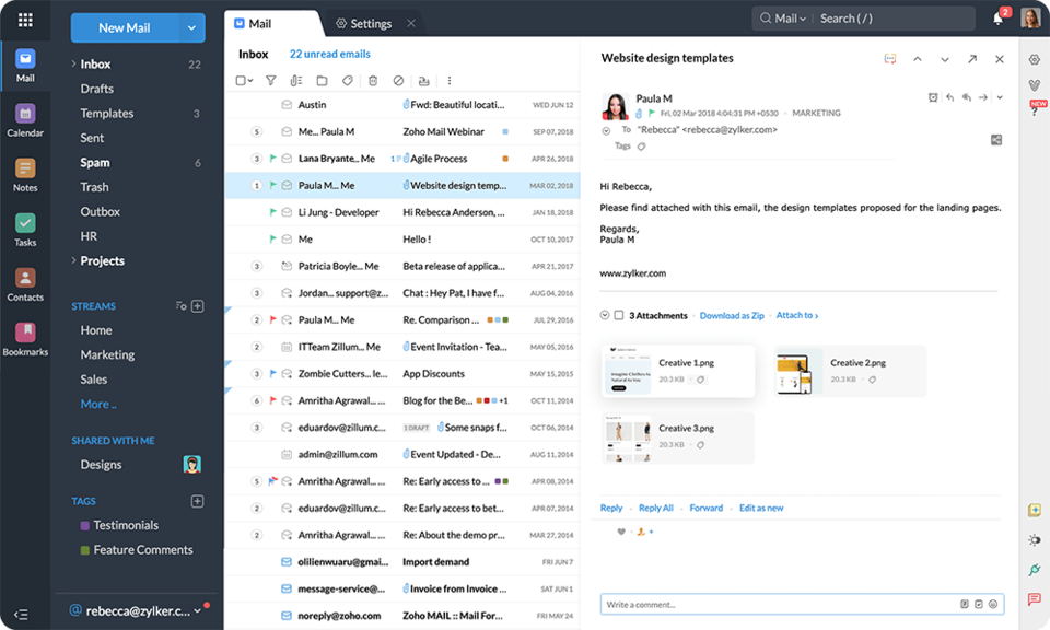 Với Zoho Mail bạn cũng có thể tạo Email tên miền doanh nghiệp chuyên nghiệp và tin cậy. Bạn có thể truy cập vào email từ bất kỳ thiết bị nào có kết nối internet. Ứng dụng còn tích hợp với các công cụ khác của Zoho như CRM và dịch vụ hội nghị trực tuyến.
