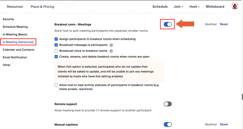 Bật tùy chọn Breakout Room pre-assign trong phần cài đặt