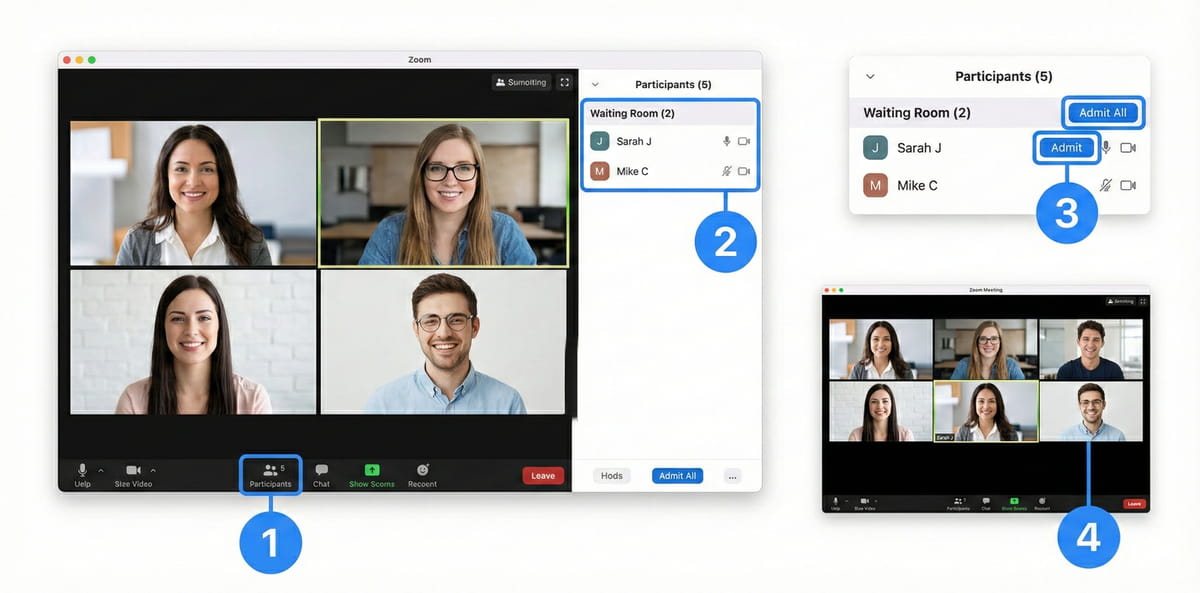 Khi đã bật phòng chờ (Waiting Room), người tham gia sẽ không vào phòng họp ngay mà được đưa vào danh sách chờ. Lúc này, Host hoặc Co-host có thể chấp nhận người tham gia theo các bước sau: